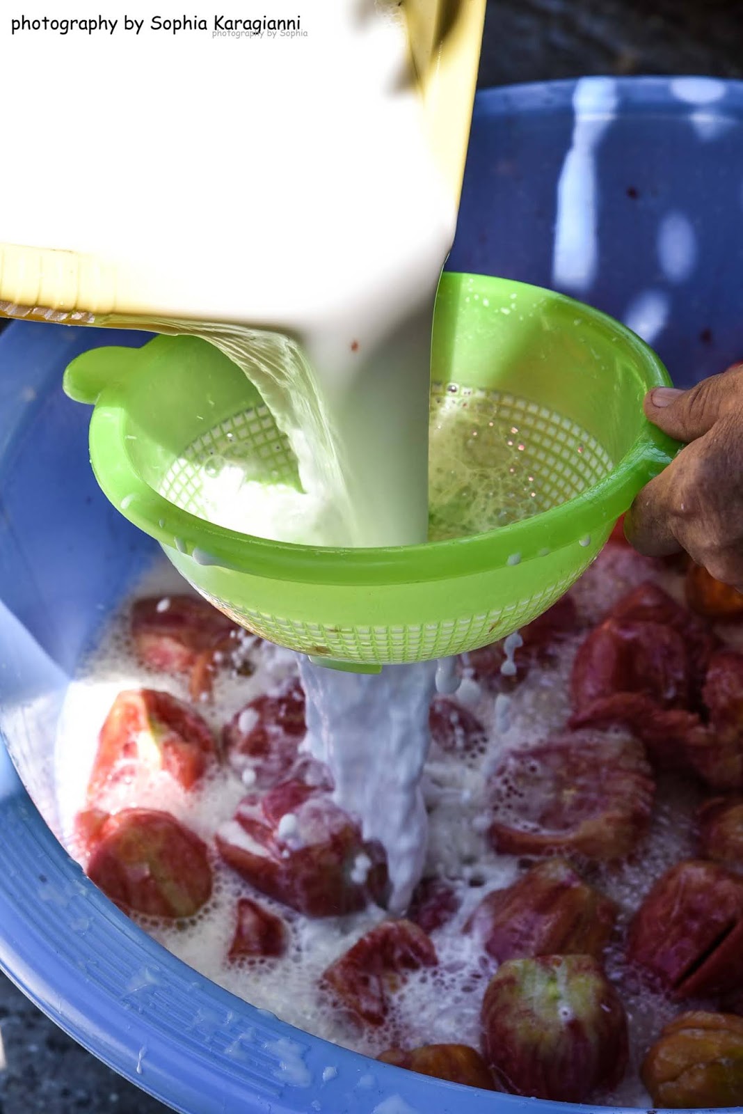Βήμα 4: Διαλύσαμε τρεις χούφτες ασβέστη σε μια λεκάνη με νερό. Κατόπιν, σουρώσαμε τον ασβέστη μέσα στη λεκάνη με τις ντομάτες μέχρι να καλυφθούν οι ντομάτες (μάλιστα βάλαμε ένα ταψί με νερό από πάνω τους για να τις κρατάει βυθισμένες). Αφήσαμε τα ντοματάκια στον ασβέστη για 1,5 ώρα.