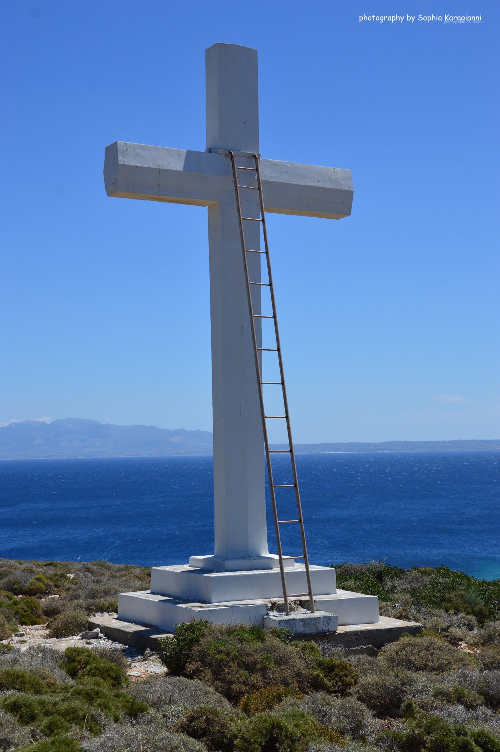 Οι υπόλοιποι ξεκινάμε από το εκκλησάκι του Σταυρού, του οποίου το καμπαναριό φαίνεται καθώς απομακρυνόμαστε προς τη νότια πλευρά του νησιού, όπου το τοπίο είναι πιο άγριο με κύριο σκηνικό τα απόκρημνα ψηλά βράχια.